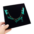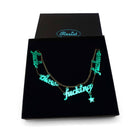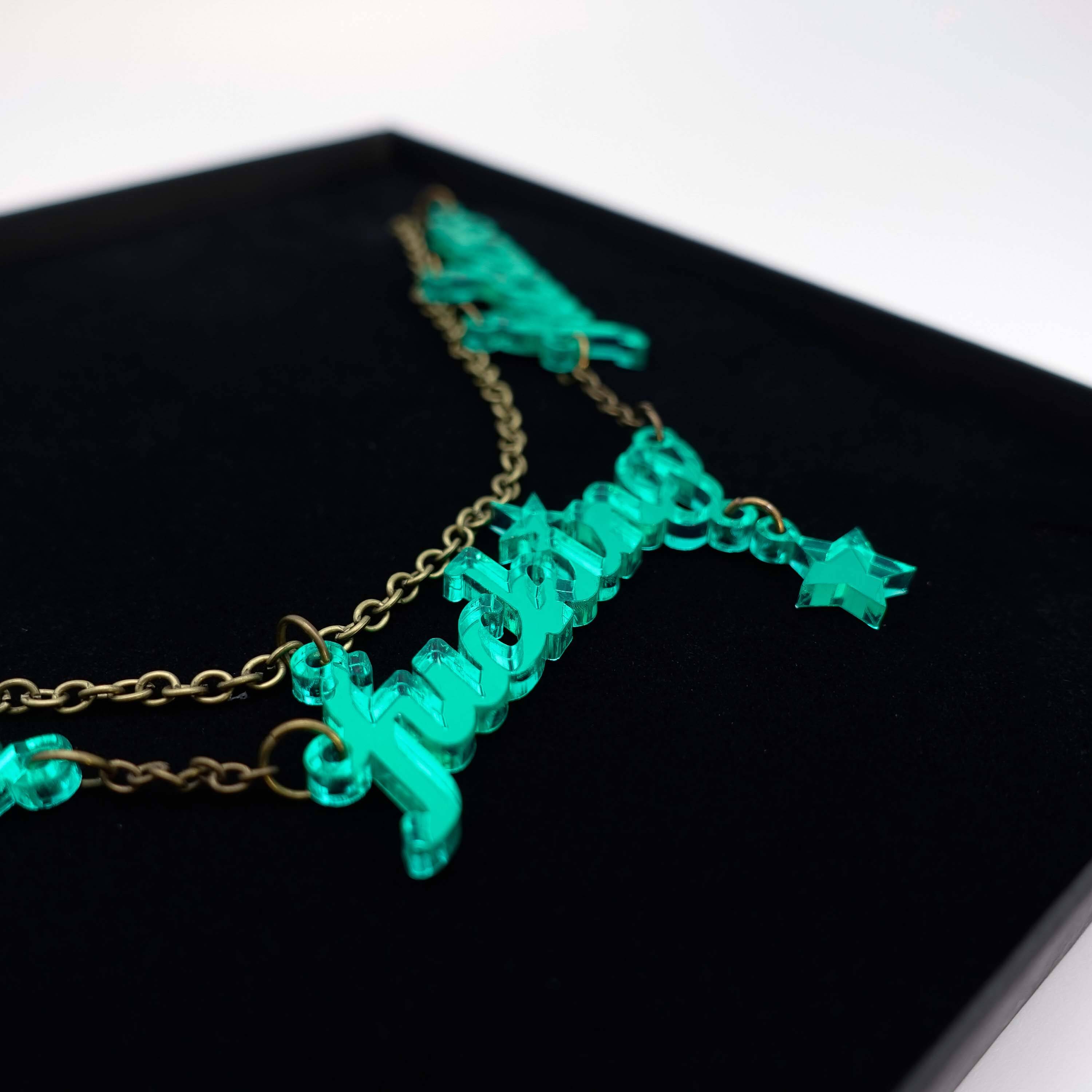 The words are cut from 3mm. acrylic and come on an antique gold chain adjustable to three lengths.