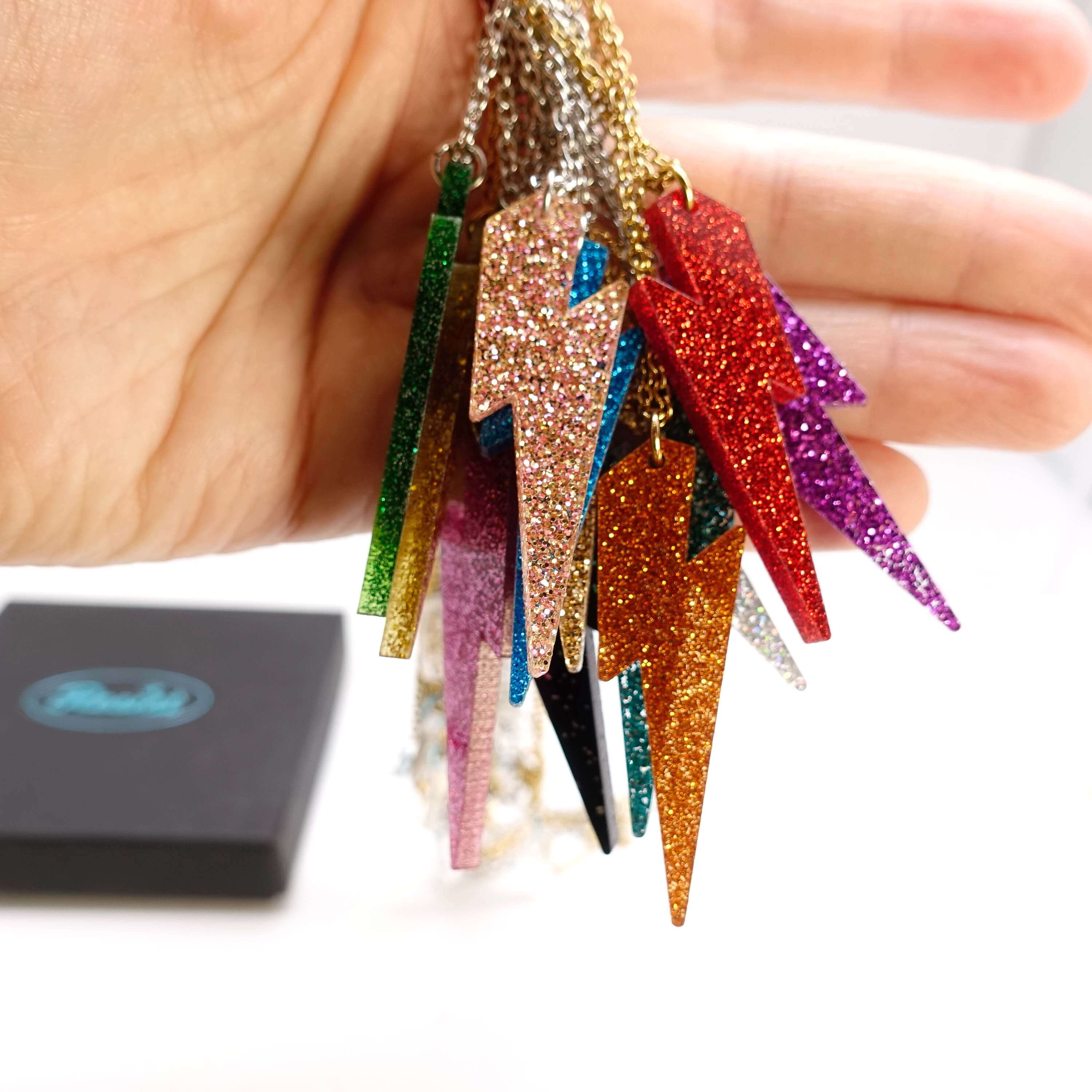 The Lightning Bolts are cut from 3mm. glitter acrylic. From top to tip they measure 5cm. (2in.). They come on a choice of chain, all adjustable to three lengths.