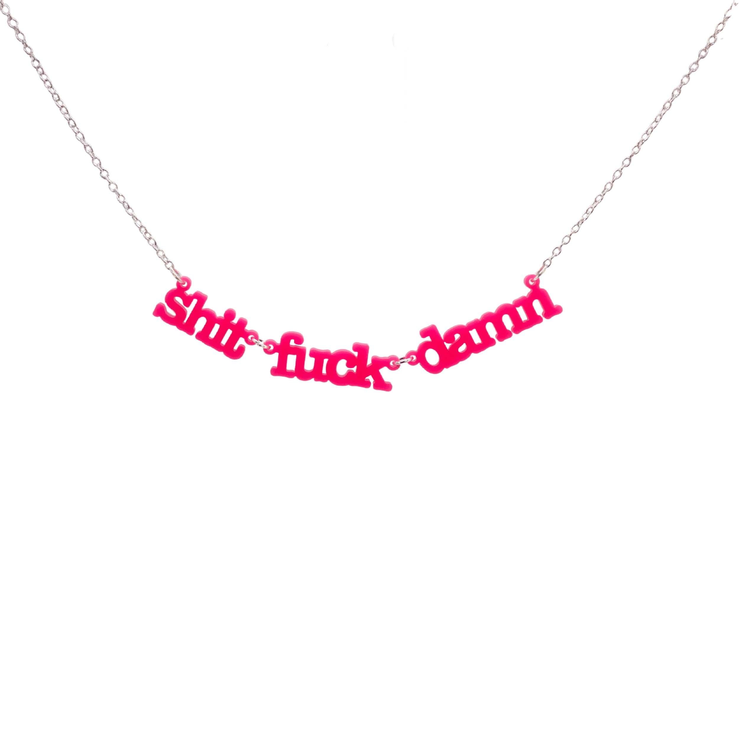 The words 'f*ck this sh*t' are cut from 3mm. acrylic and linked together measure 10.5cm. across. The chain is adjustable to three lengths. The shortest is 28.5 and the longest is 38.5cm.