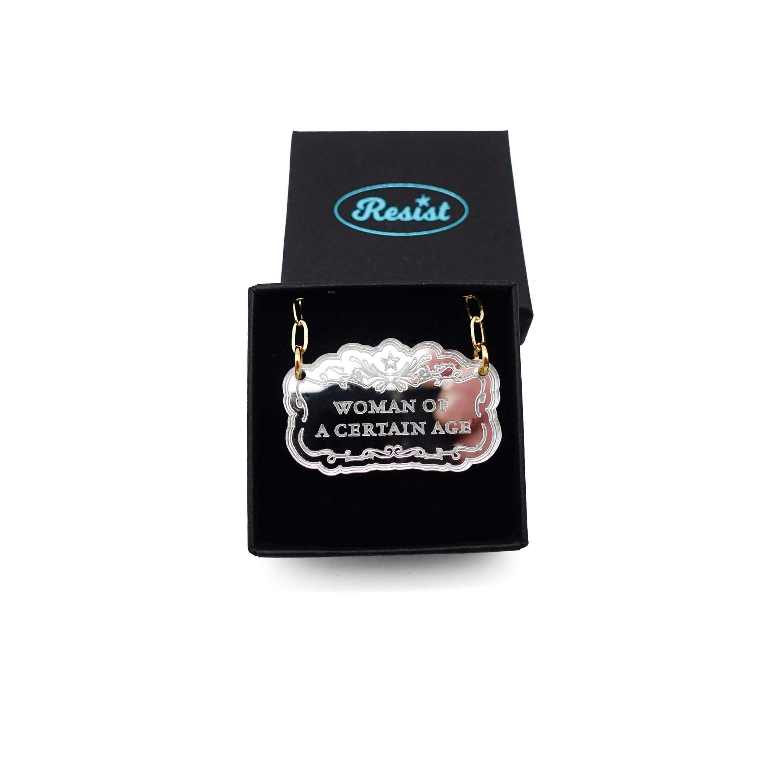 A lovely little necklace etched with the words, Woman of a Certain Age, in a design that has a slight nod to the label of a fine whiskey, because we only get better as we get older, innit?